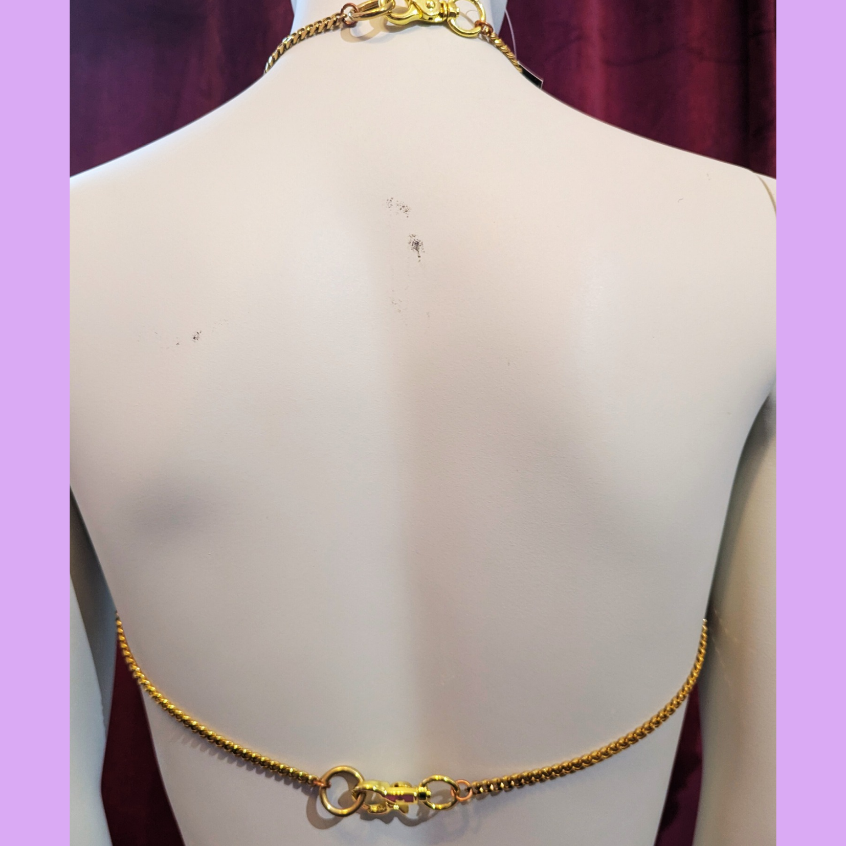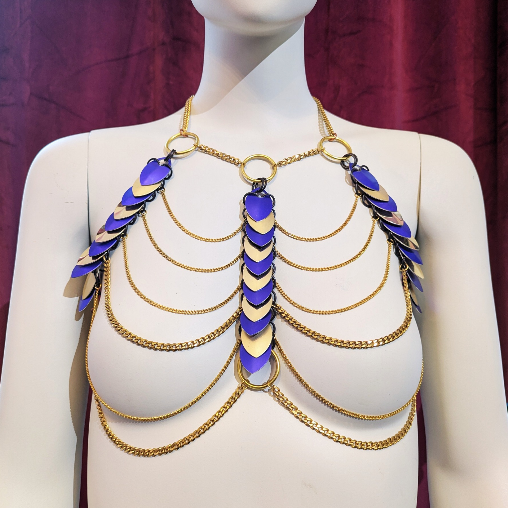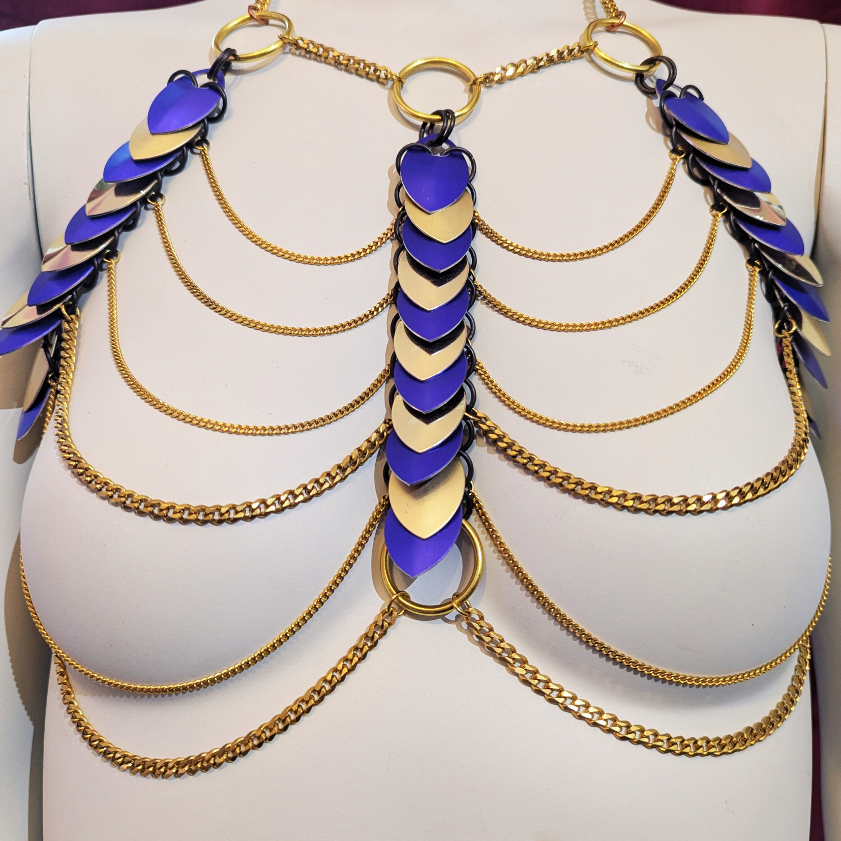 The Aphrodite Harness in purple and gold is a striking statement piece designed to create an exciting, bold look. Its intricate scale-chain design makes it suitable for festivals as well as kinky parties. The Aphrodite Harness stands for confidence, creativity, and daring self-expression. This avant-garde harness is made from high-quality stainless steel, which is both skin-friendly and durable.