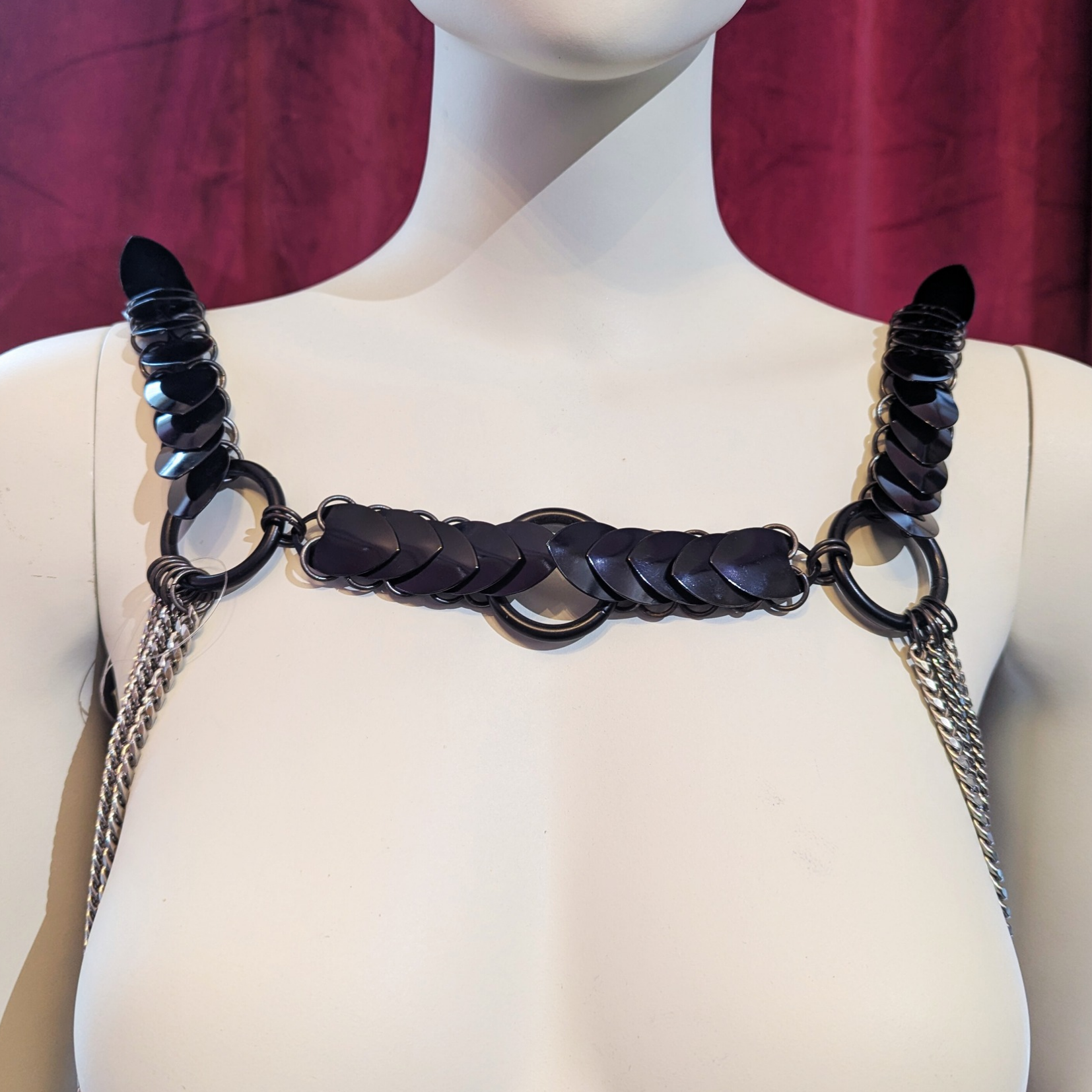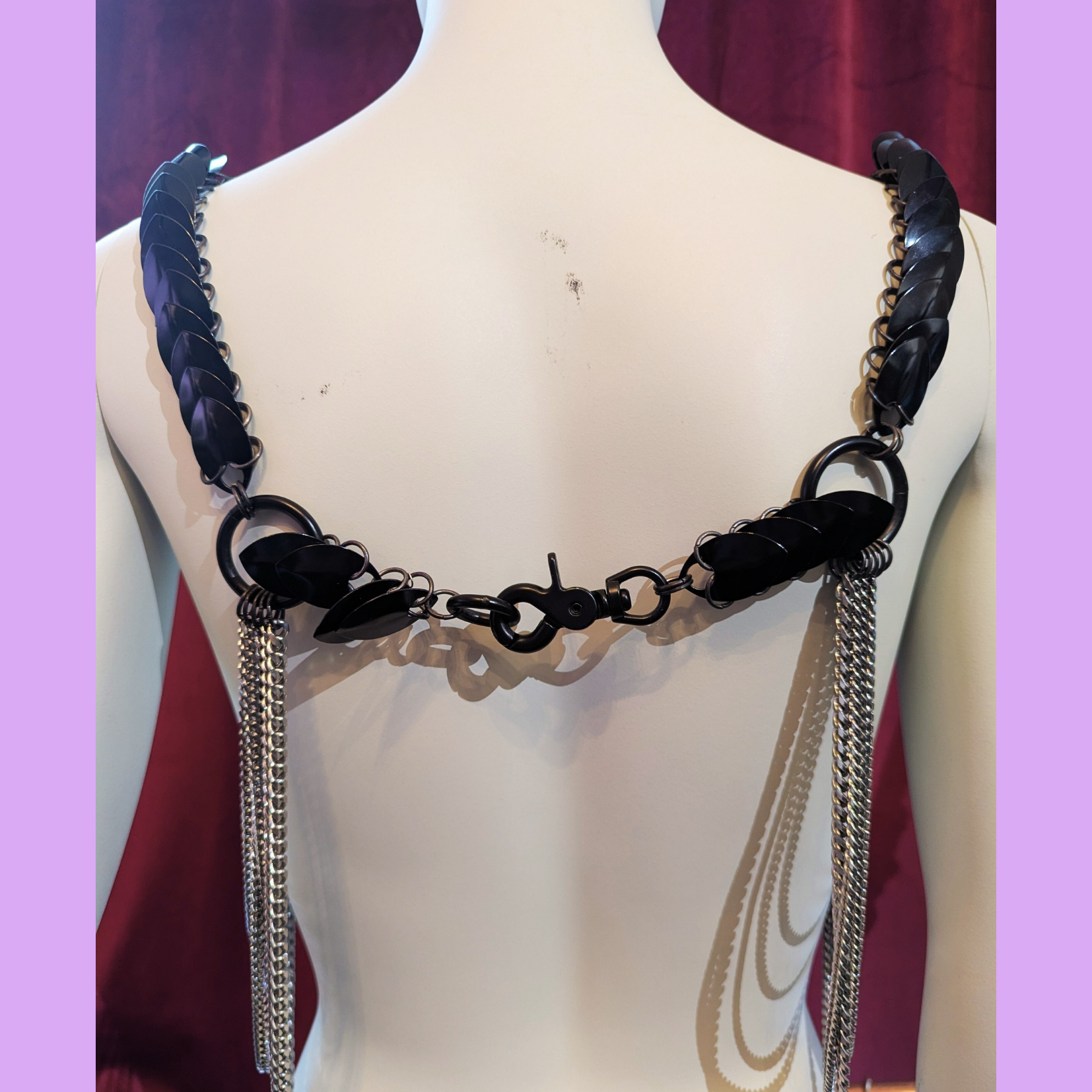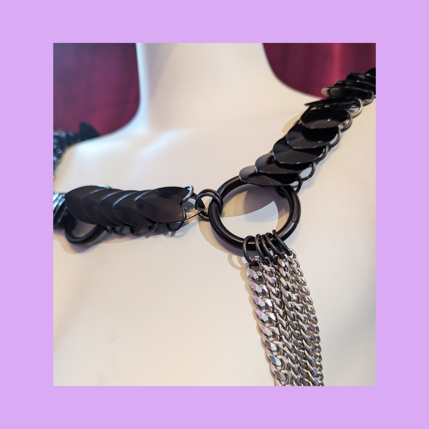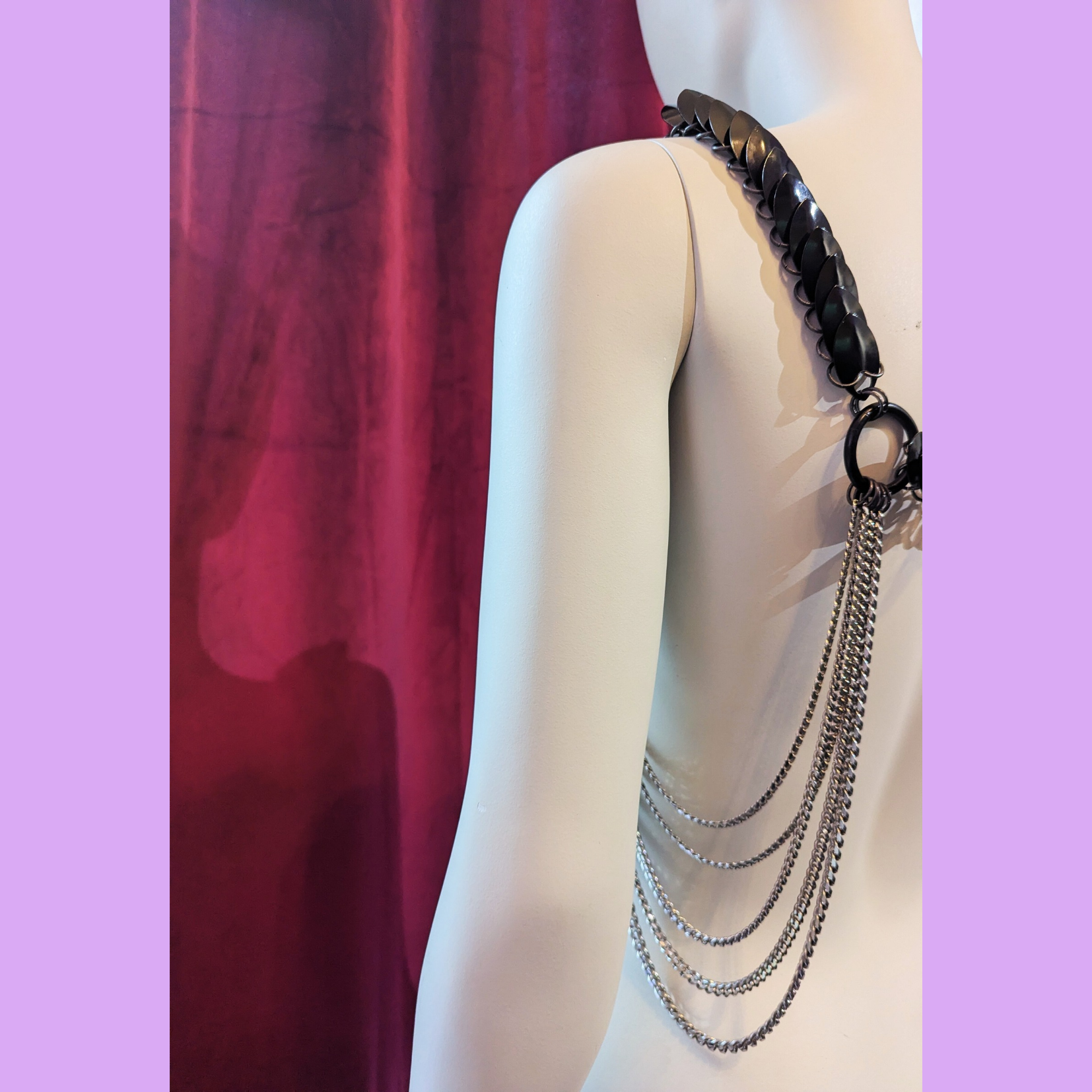 The Black Aphrodite Desire Harness in purple and gold is a striking statement piece designed to create an exciting, bold look. Its intricate scale-chain design makes it suitable for festivals as well as kinky parties. The Harness stands for confidence, creativity, and daring self-expression. This avant-garde harness is made from high-quality stainless steel, which is both skin-friendly and durable.