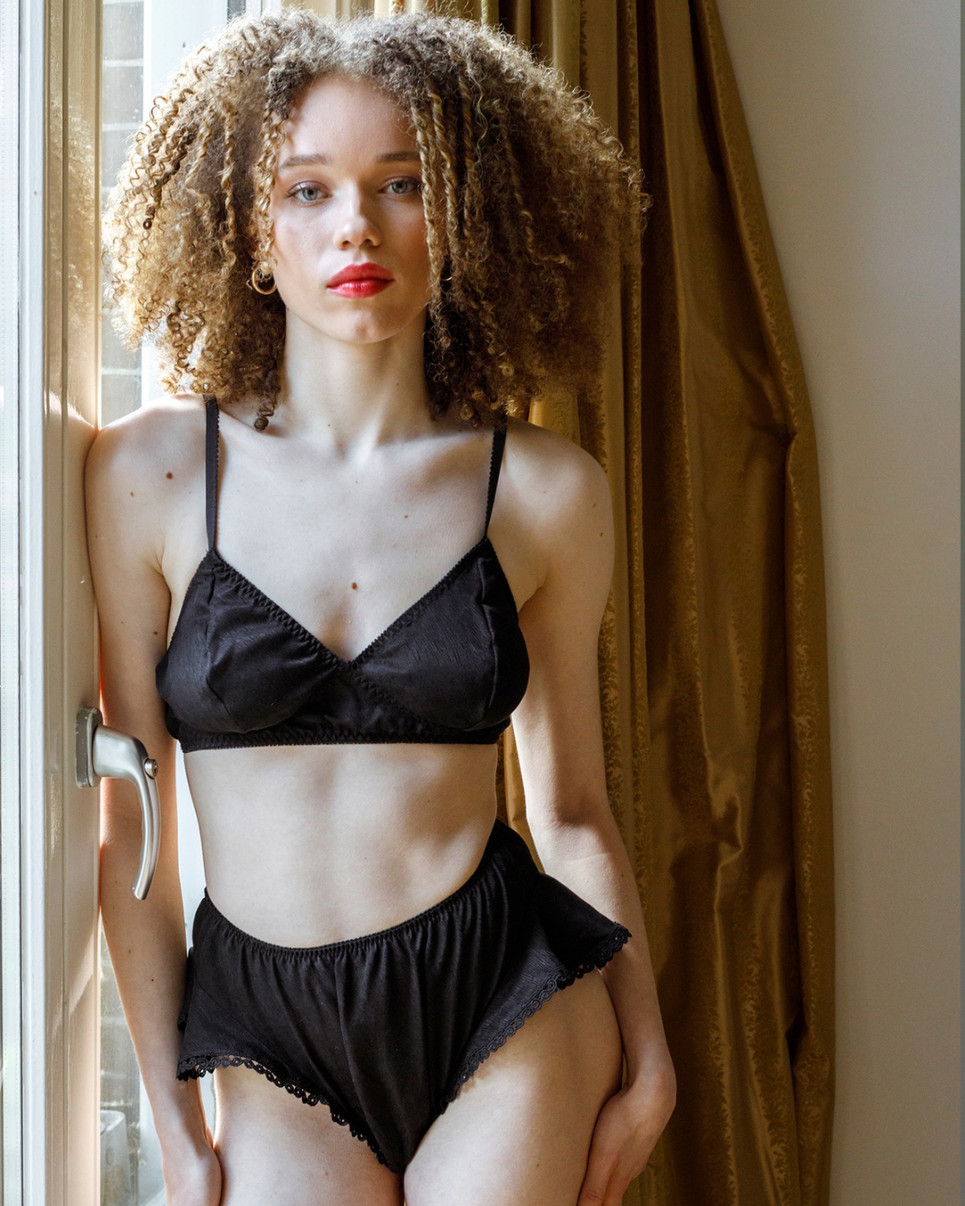 CUPRO-TENCEL™ Butterfly Slip verziert mit einer Rüsche mit exklusiven Spitzenbesätzen von Plauener Spitze. Der High Waist Slip, gefertigt in limitierter Auflage in Deutschland, besteht aus nachhaltigem CUPRO-TENCEL™ Jacquard-Stoff. Er verleiht dir einen Hauch von vintage-inspirierter dunkler Romantik und eignet sich sowohl als Nachtwäsche und Lingerie.