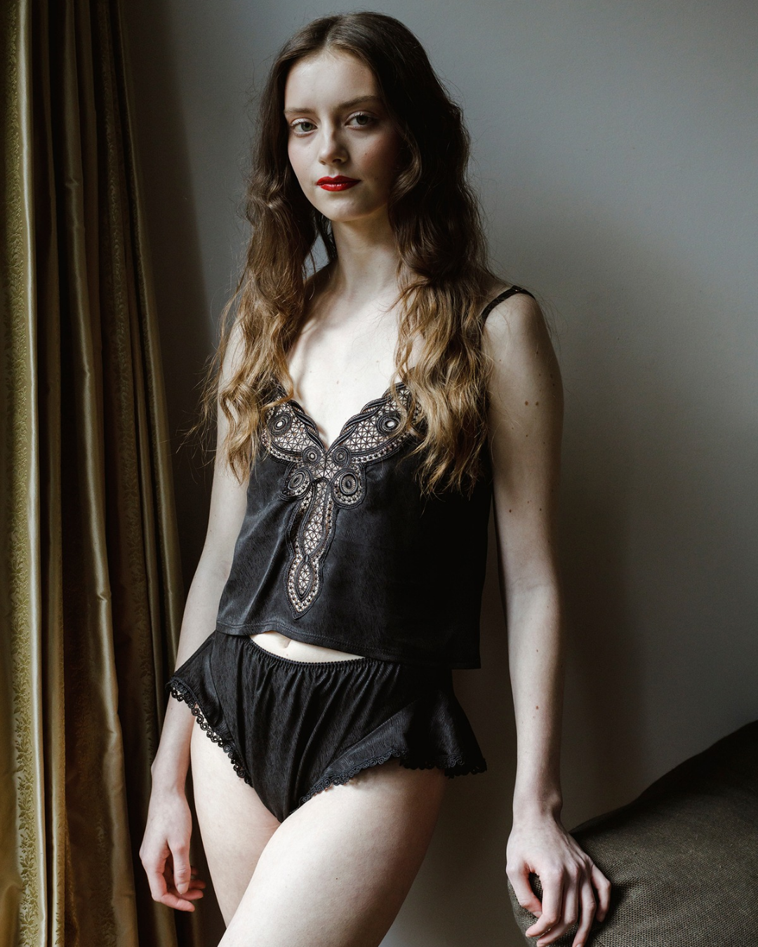 Cupro-Tencel™ Camisole Top decorated with an exclusive handmade lace trim from Plauener Spitze. The top, produced in a limited edition in Germany, is made from sustainable Cupro-Tencel™ Jacquard fabric. There is a touch of vintage-inspired dark romance, making it suitable as nightwear, lingerie, or even as a casual cropped top.