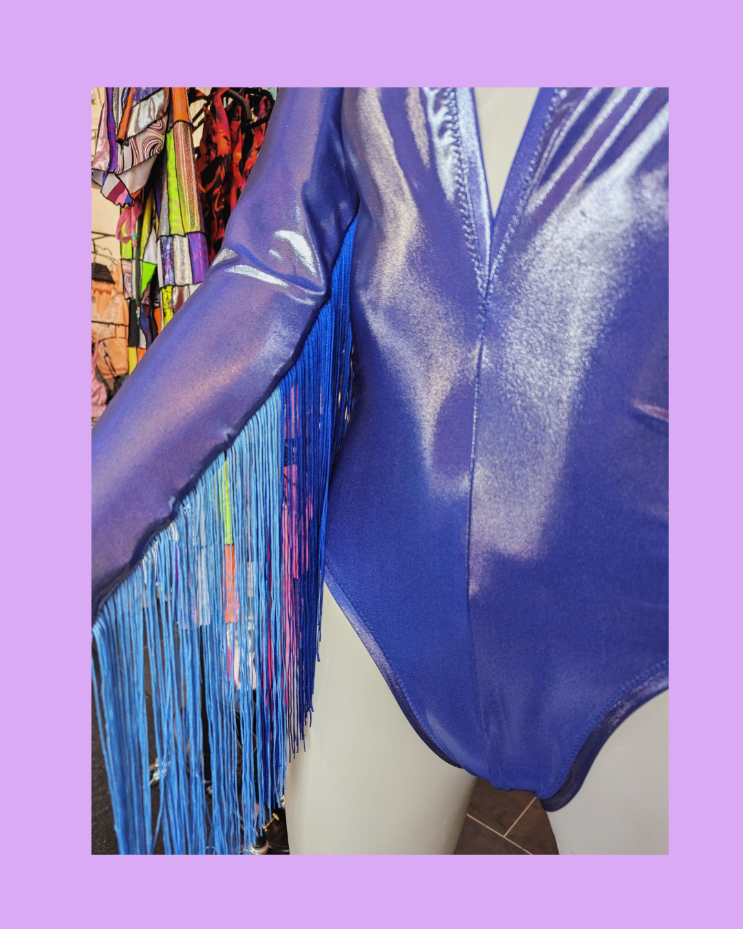This fringed bodysuit dark+light blue, handmade in Berlin, is your perfect festival or party outfit! The glittering fabric wonderfully reflects the light and the bright fringe accents swirl around your movements. With this extravagant look, you’ll be the absolute showstopper on the dance floor!