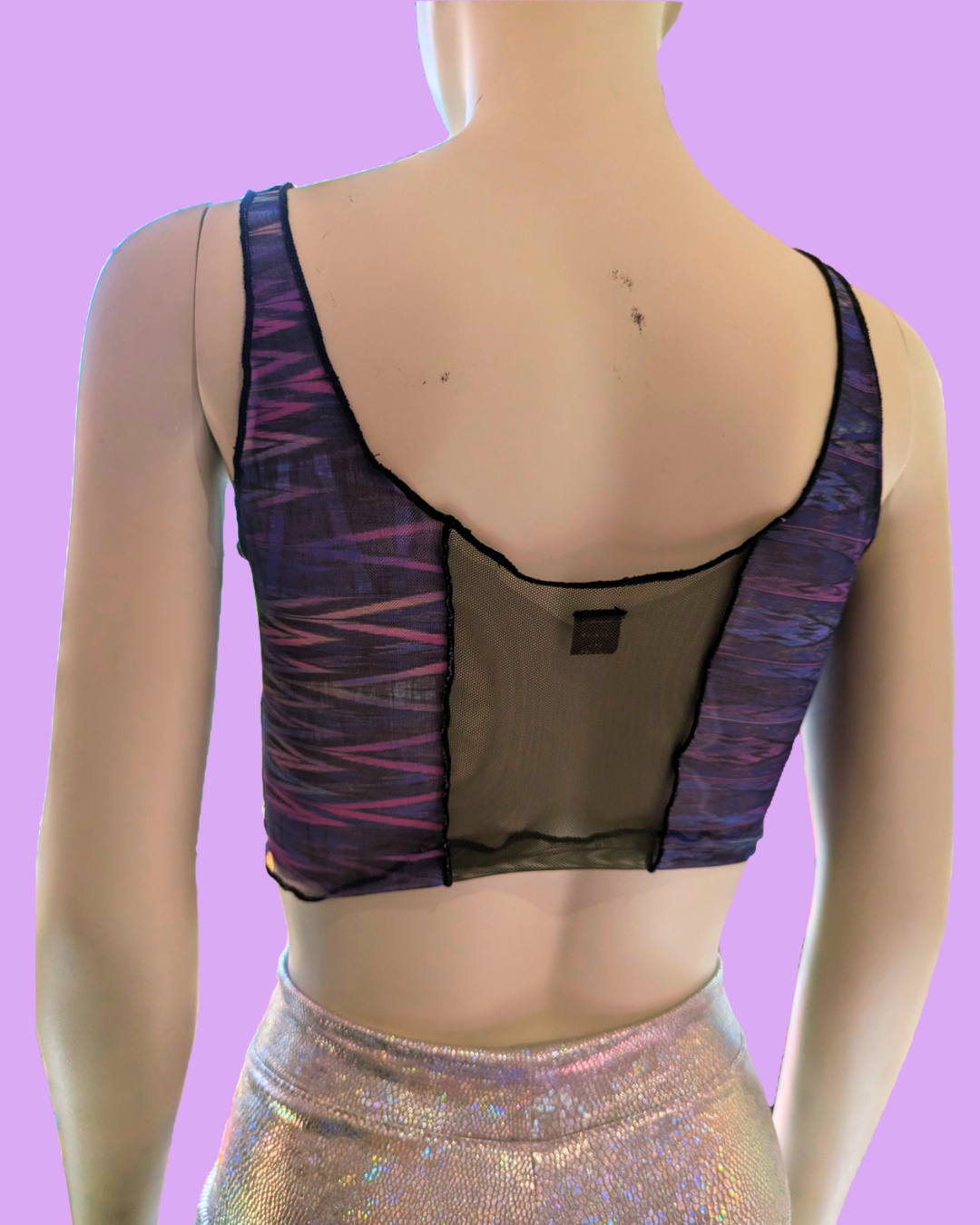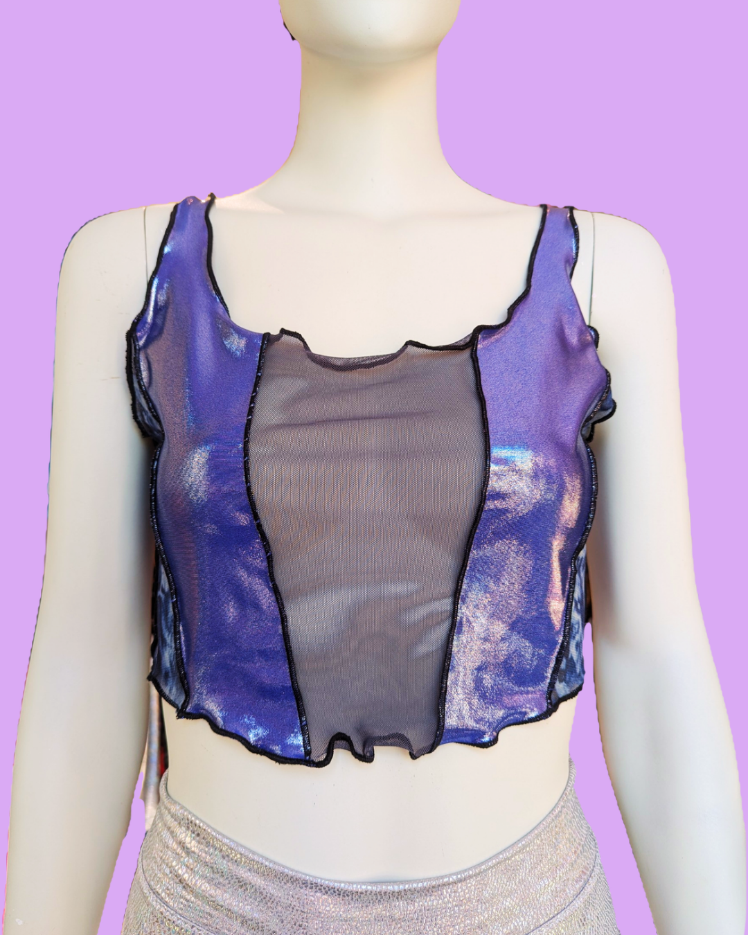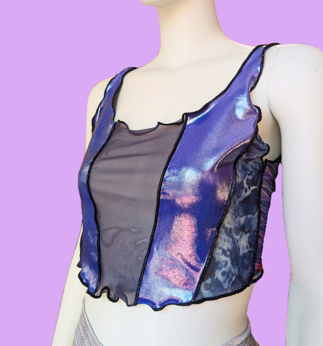 This mesh top purple, handmade in Berlin, is your perfect party companion! The shiny fabric immediately catch the eye! The hinted corset-style cut gives the top an edgy and extravagant look. Each piece is unique and truly one of a kind.