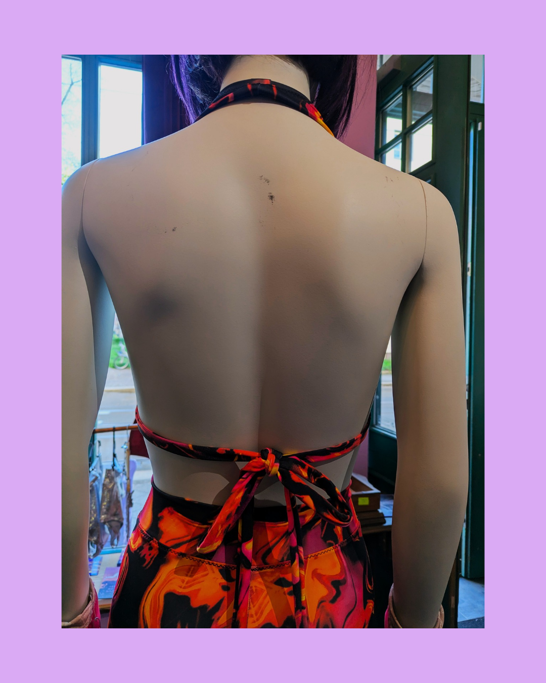 This red swirl neckholder top, handmade in Berlin, is your perfect party companion! The patterned fabric with its unique color gradient immediately catches the eye. The top can be tied at the back, allowing you to adjust it flexibly to your body shape.
