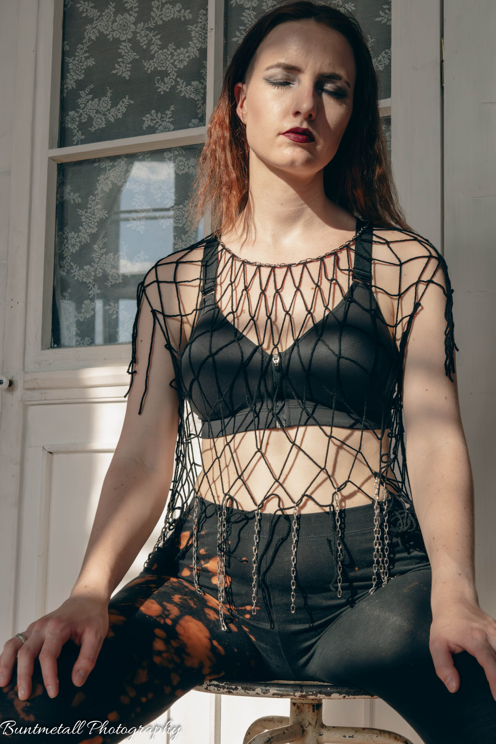 Das handmade Netztop Arachne ist ein zentrales Styling-Element, um einen extravaganten, kinky Look zu kreieren. Es besteht aus einem handgemachten, schwarzen Baumwoll-Netz und silberfarbenen Ketten, welche am unteren Rand befestigt sind. Das handmade Netztop Arachne wurde mit Sorgfalt in Leipzig handgefertigt.