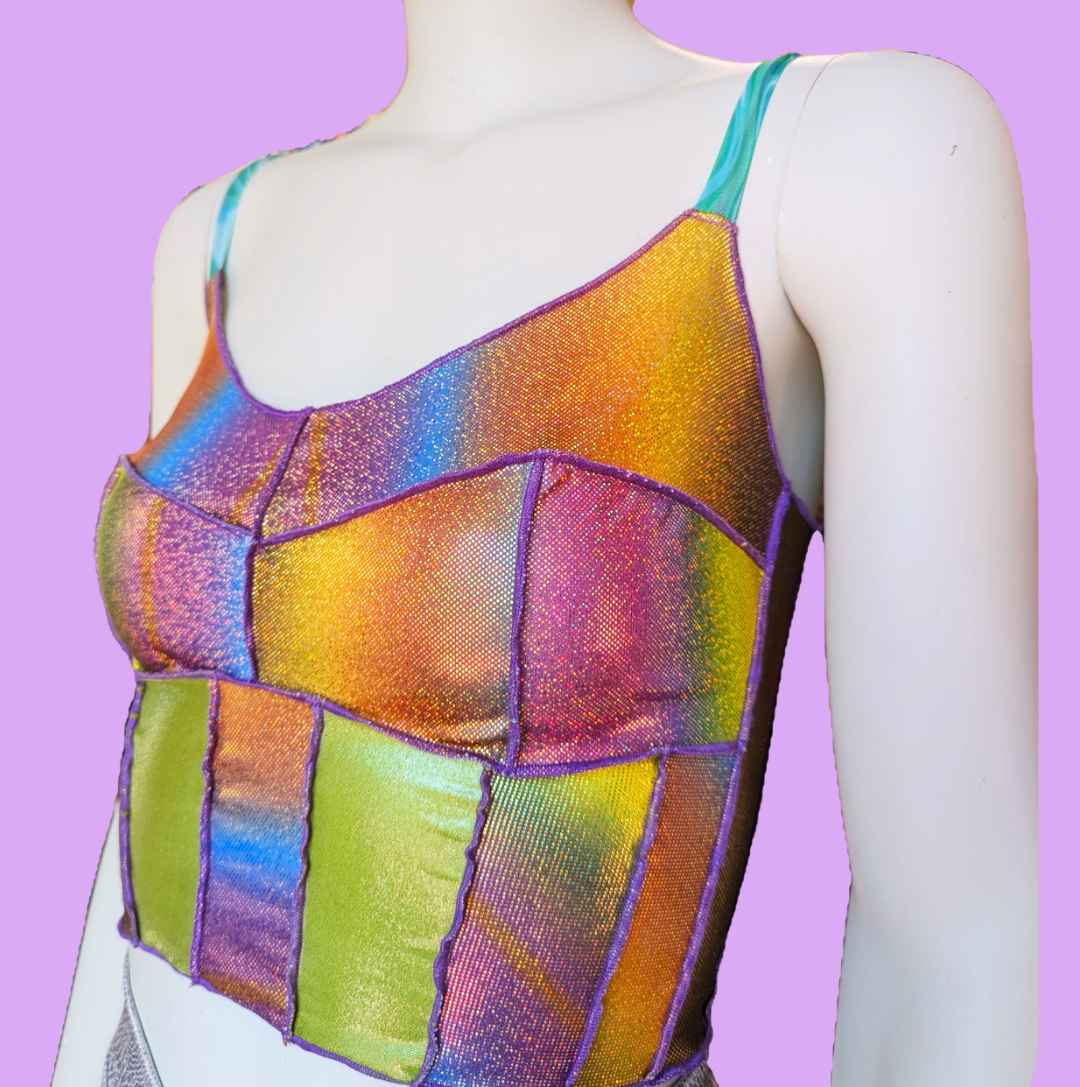 This patchwork top gold, handmade in Berlin, is your perfect party companion! The shiny fabric immediately catch the eye! The hinted corset-style cut gives the top an edgy and extravagant look. Each piece is unique and sustainable. The patchwork construction is made from repurposed fabric scraps, creating a chic and eco-conscious design.