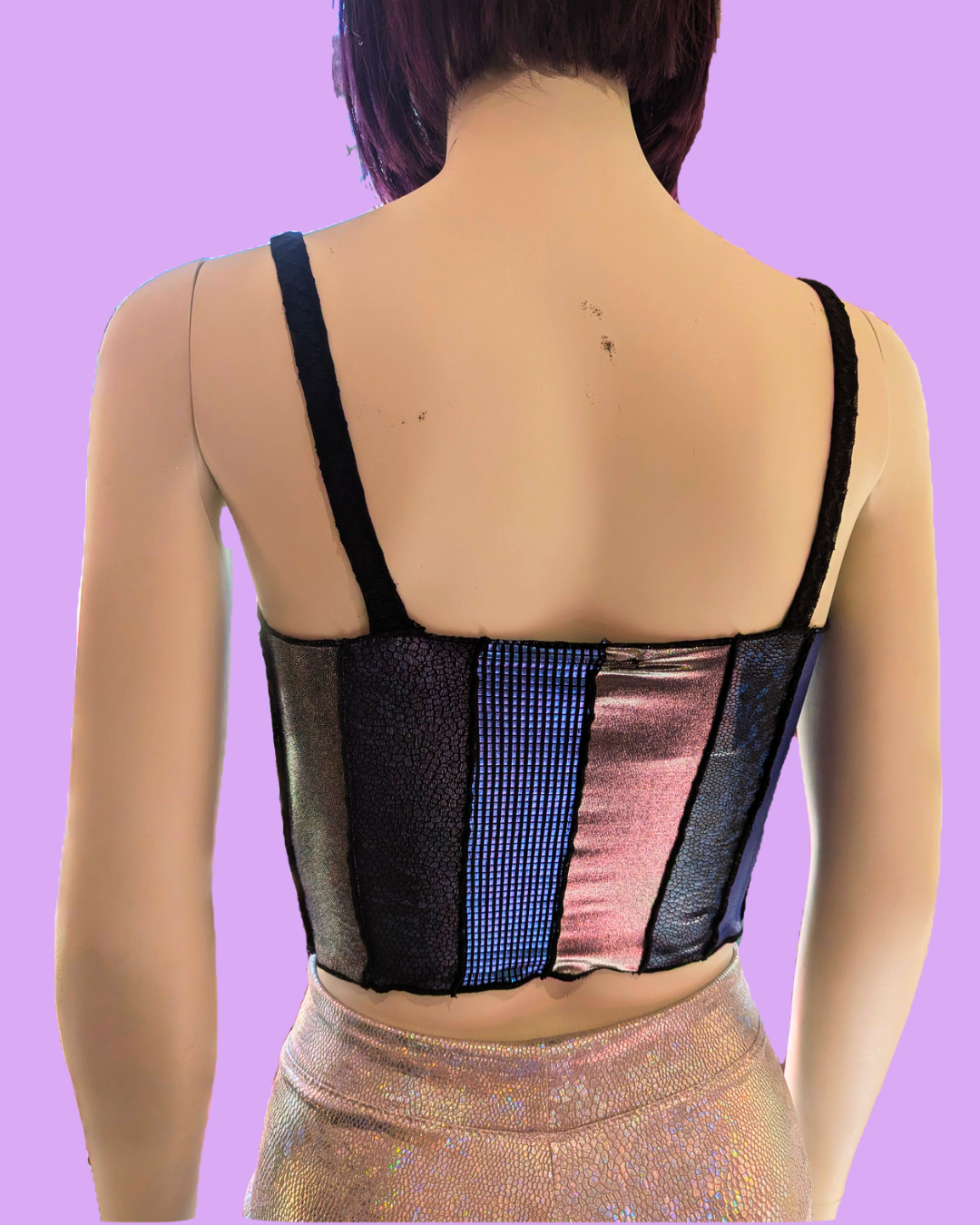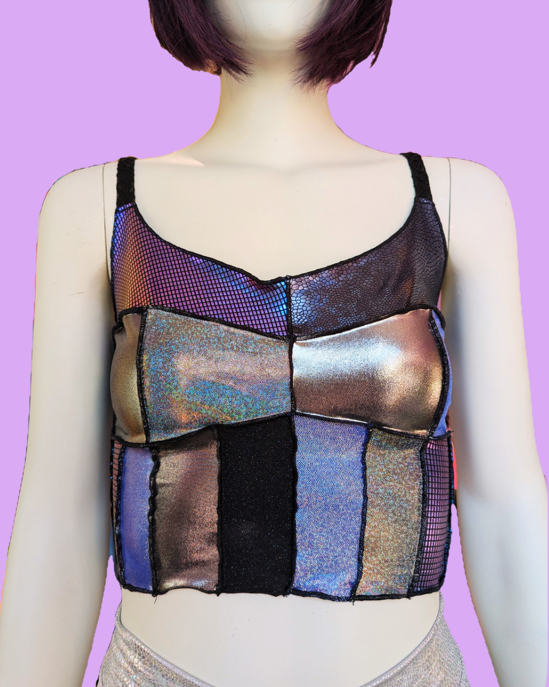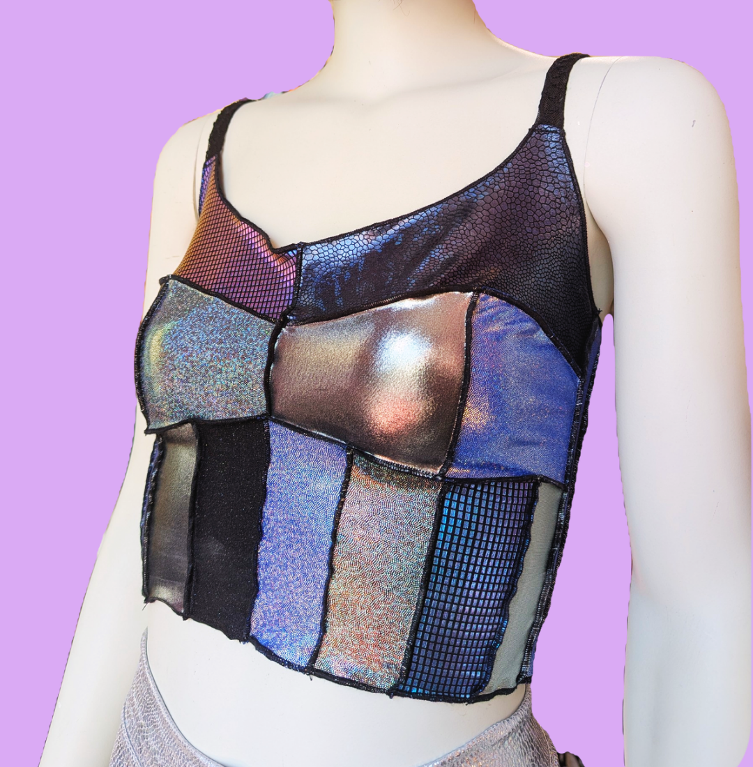 This patchwork top purple, handmade in Berlin, is your perfect party companion! The shiny fabric immediately catch the eye! The hinted corset-style cut gives the top an edgy and extravagant look. Each piece is unique and sustainable. The patchwork construction is made from repurposed fabric scraps, creating a chic and eco-conscious design.