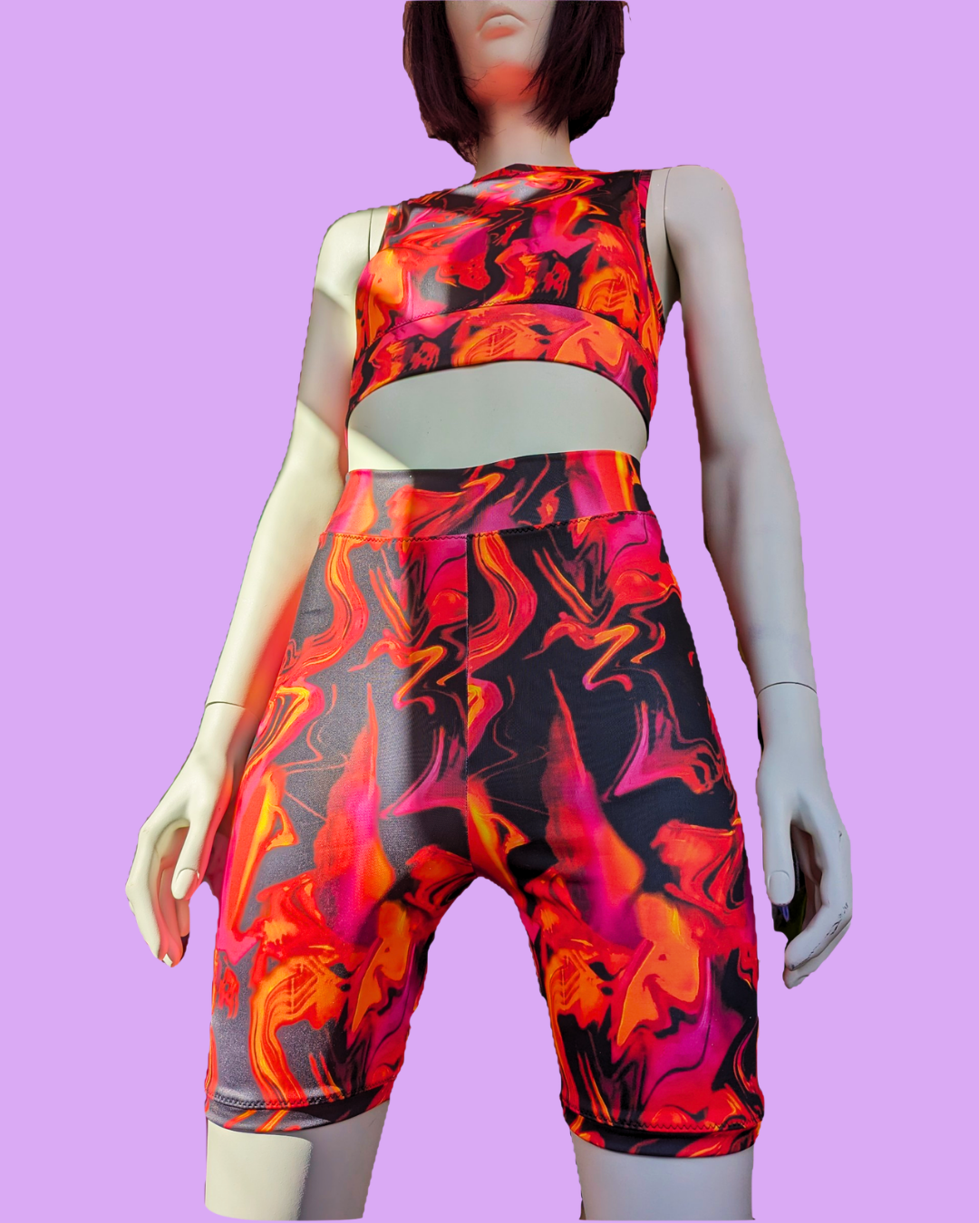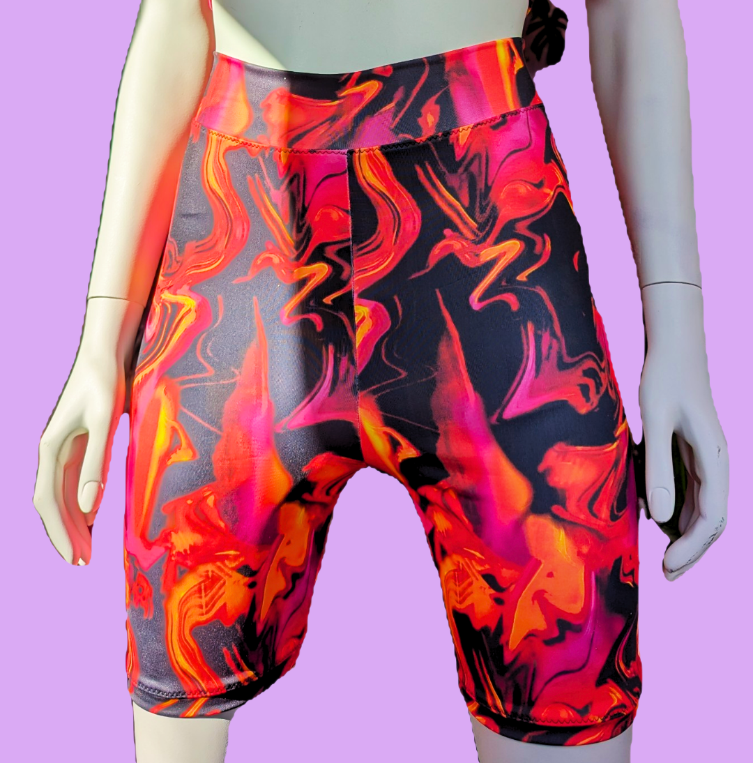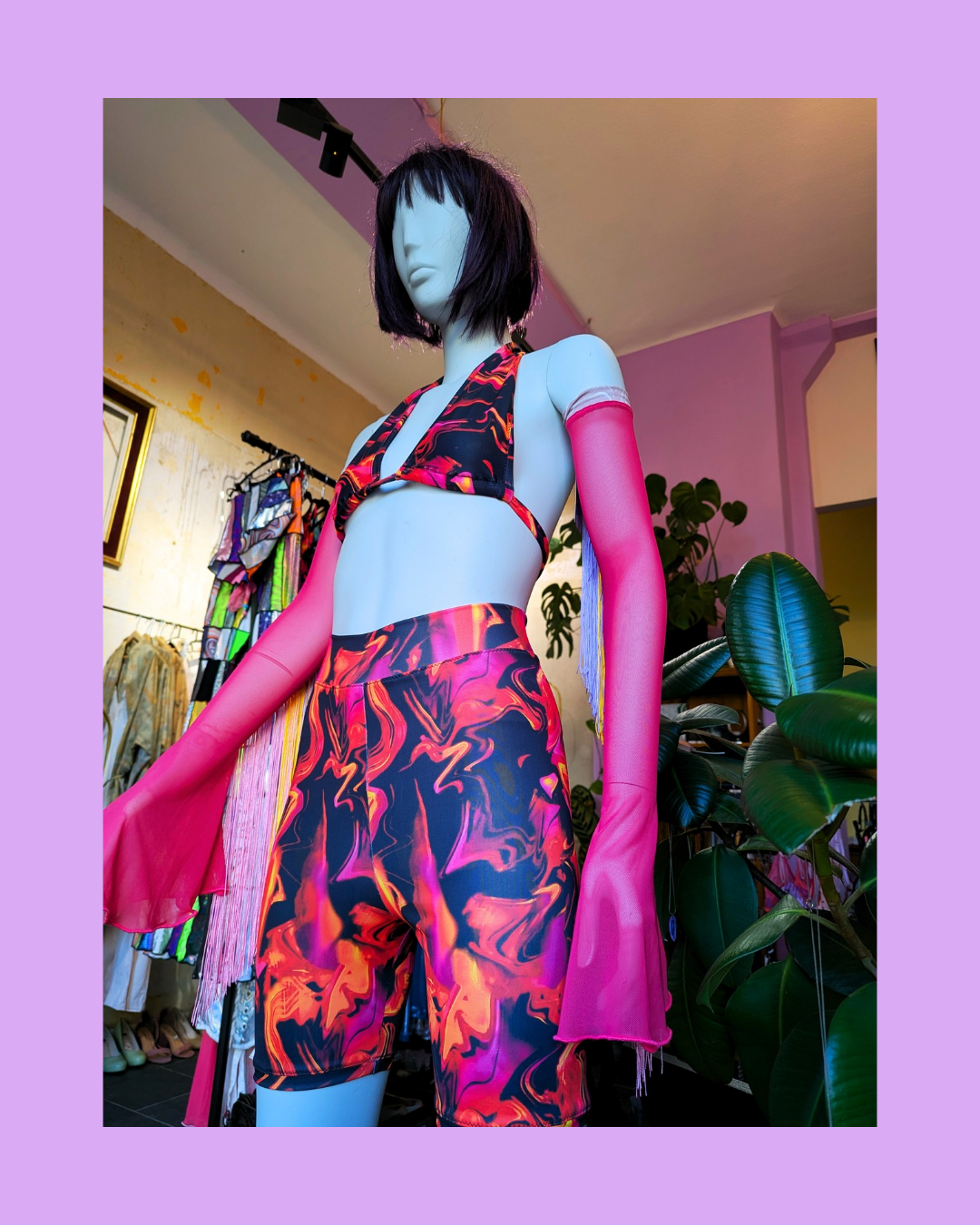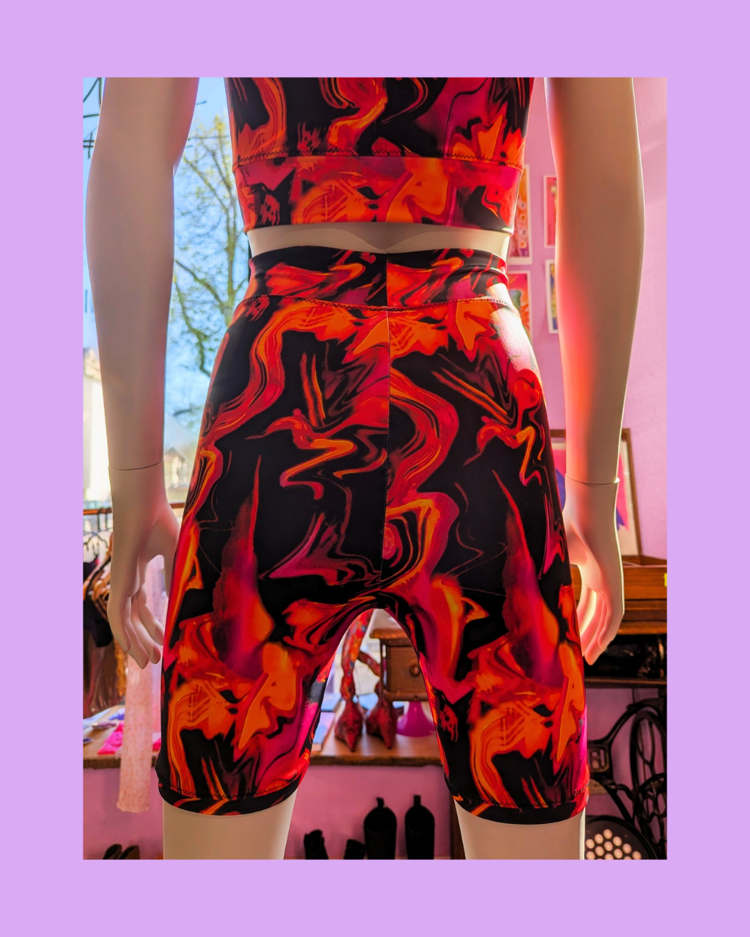 These red swirl biker shorts, handmade in Berlin, are your perfect party companion! The patterned fabric with its unique color gradient immediately catches the eye. Thanks to the high-waist cut, you can move freely and fully focus on dancing.