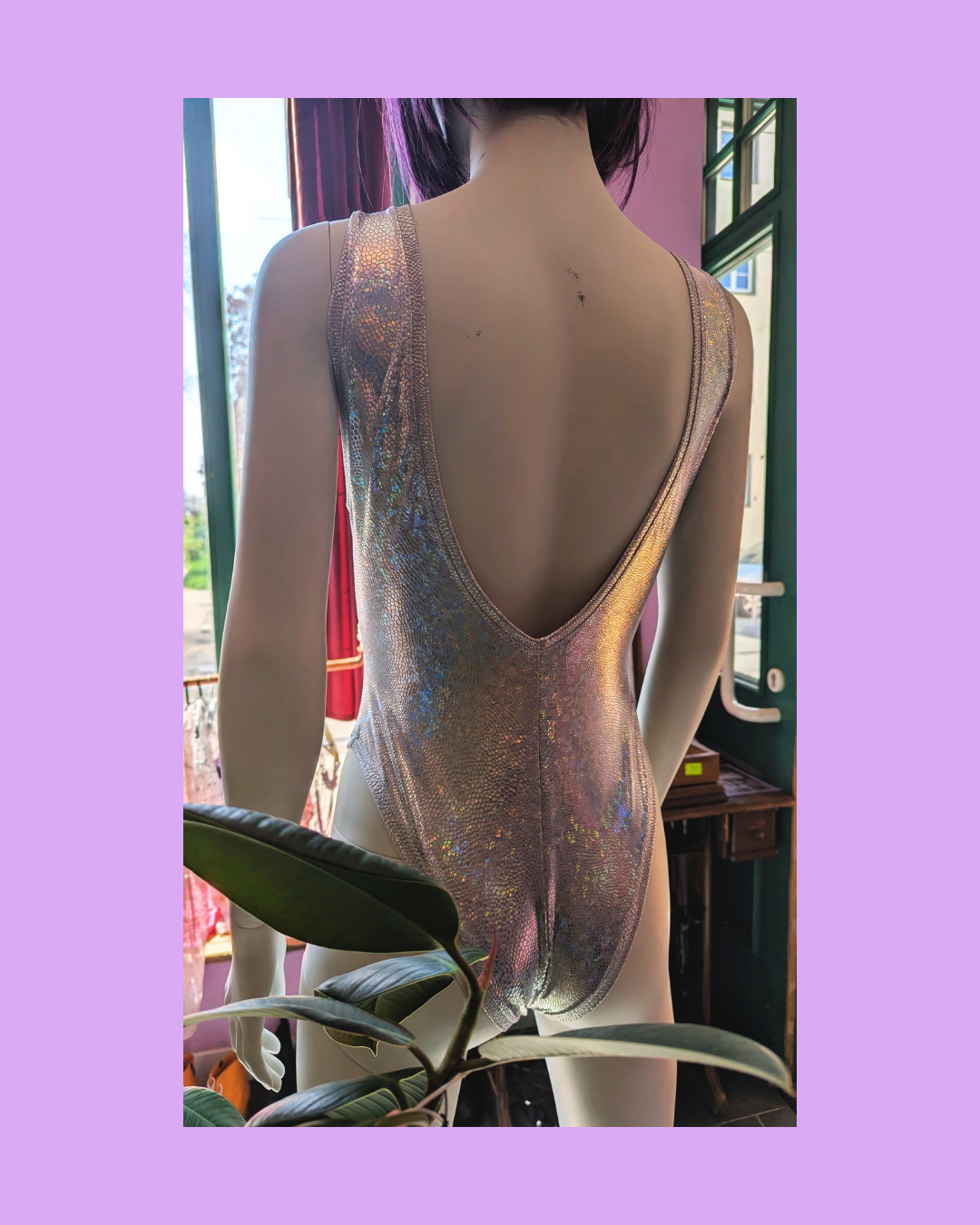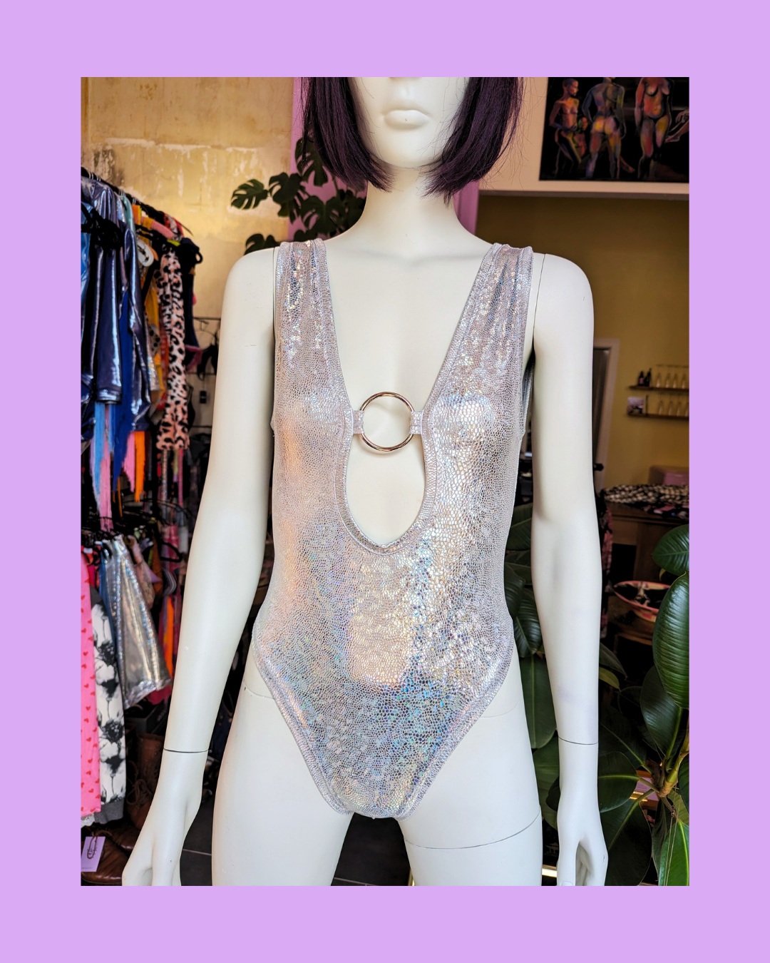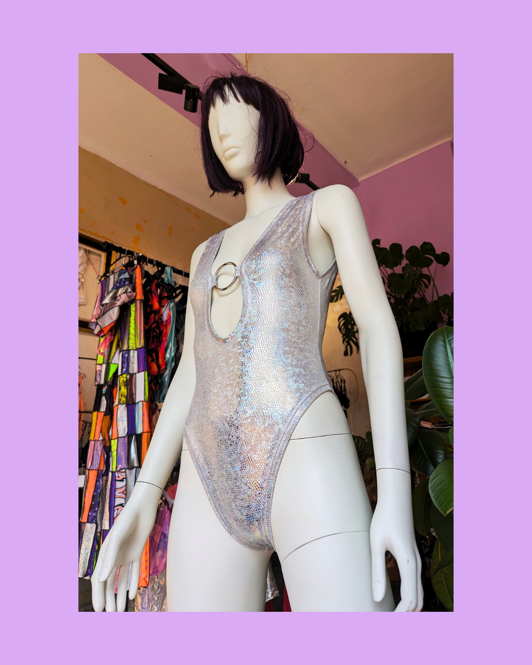 This ring bodysuit silver, handmade in Berlin, is your perfect festival or party outfit! The glittering fabric wonderfully reflects the light andthe O-ring neckline gives the bodysuit that certain something. With this extravagant look, you’ll be the absolute showstopper on the dance floor!