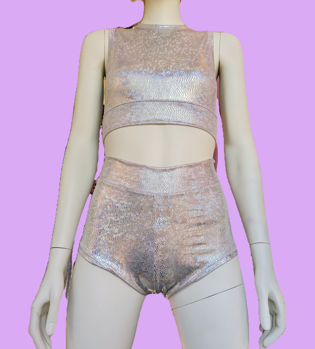 The silver shorts, handmade in Berlin, are your perfect party companion! The sparkling fabric beautifully reflects the light, and the silver color immediately catches the eye. Thanks to the high-waist cut, you can move freely and fully focus on dancing.